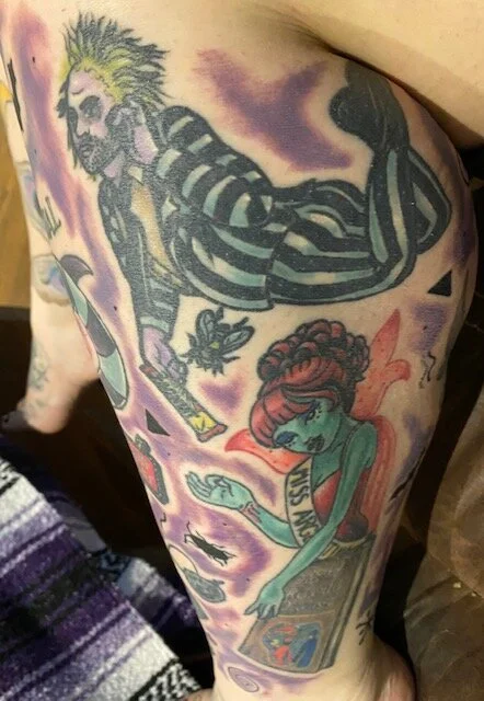 For the last year Heather has loving fed into my Beetlejuice obsession with a lower leg sleeve. I want to start by making sure the world knows that Heather is a phenomenal human, friend and super talented artist. If you ever spend time talking with her about Queer Politics, Sex-Positive Sex Education or Body Image you will know how truly wonderful Heather is (and those are just a few things!).