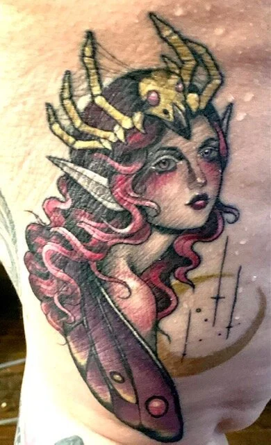 Court created a beautiful dark and enchanting death fairy. My thought behind this was in part from the Celtic Folklore of the Fairy Queen Medb. She has many stories written about here but all the following are consistent: She was considered beautiful beyond measure, cunning and manipulative, her names means “she who intoxicates” and this would lead to many men’s success and their downfall, but one thing is clear, she held the power, she was in charge and she enacted as she felt fit. I can think of no greater image to accompany the other images on my “underworld leg” than this fairy.